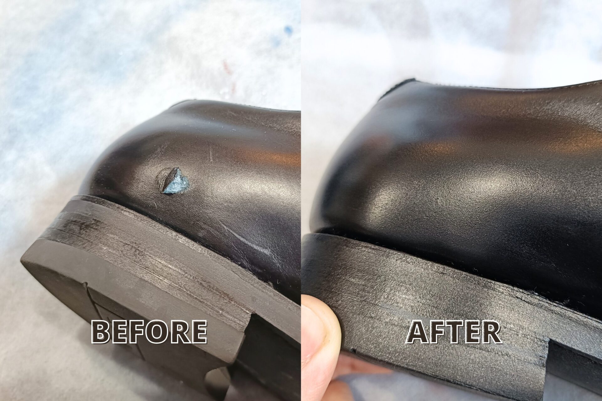 三陽山長 踵のキズ補修|えぐれた革の凹凸を再現