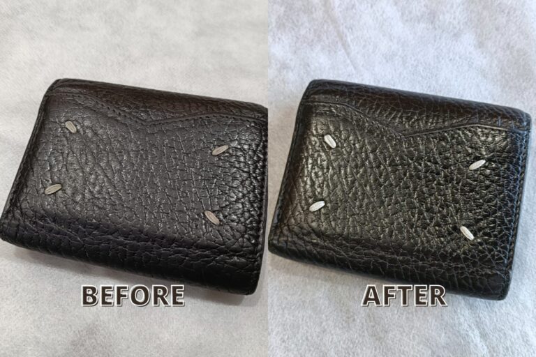 ロゴ周りだけでなく、財布全体のレザーケアも同時に行い艶感と質感のバランスを整えています。