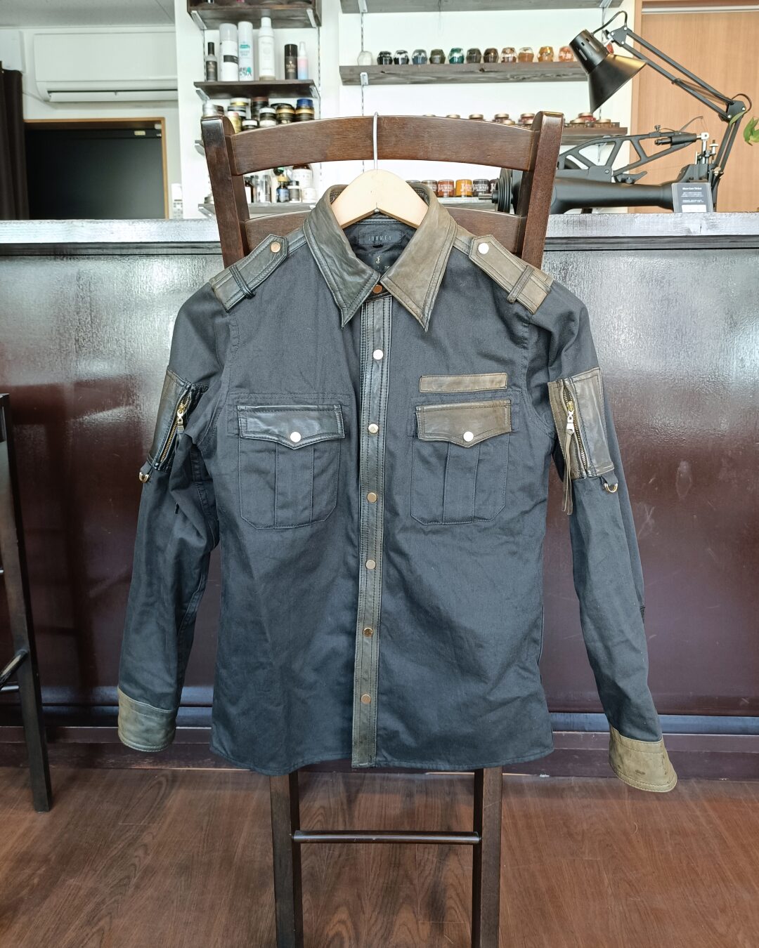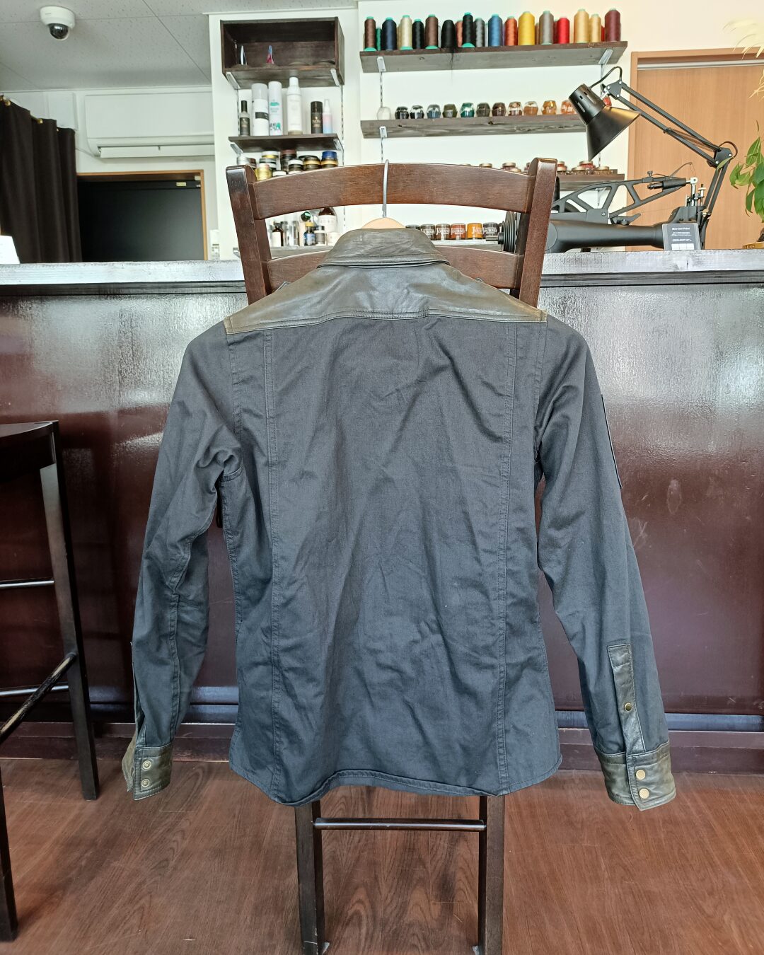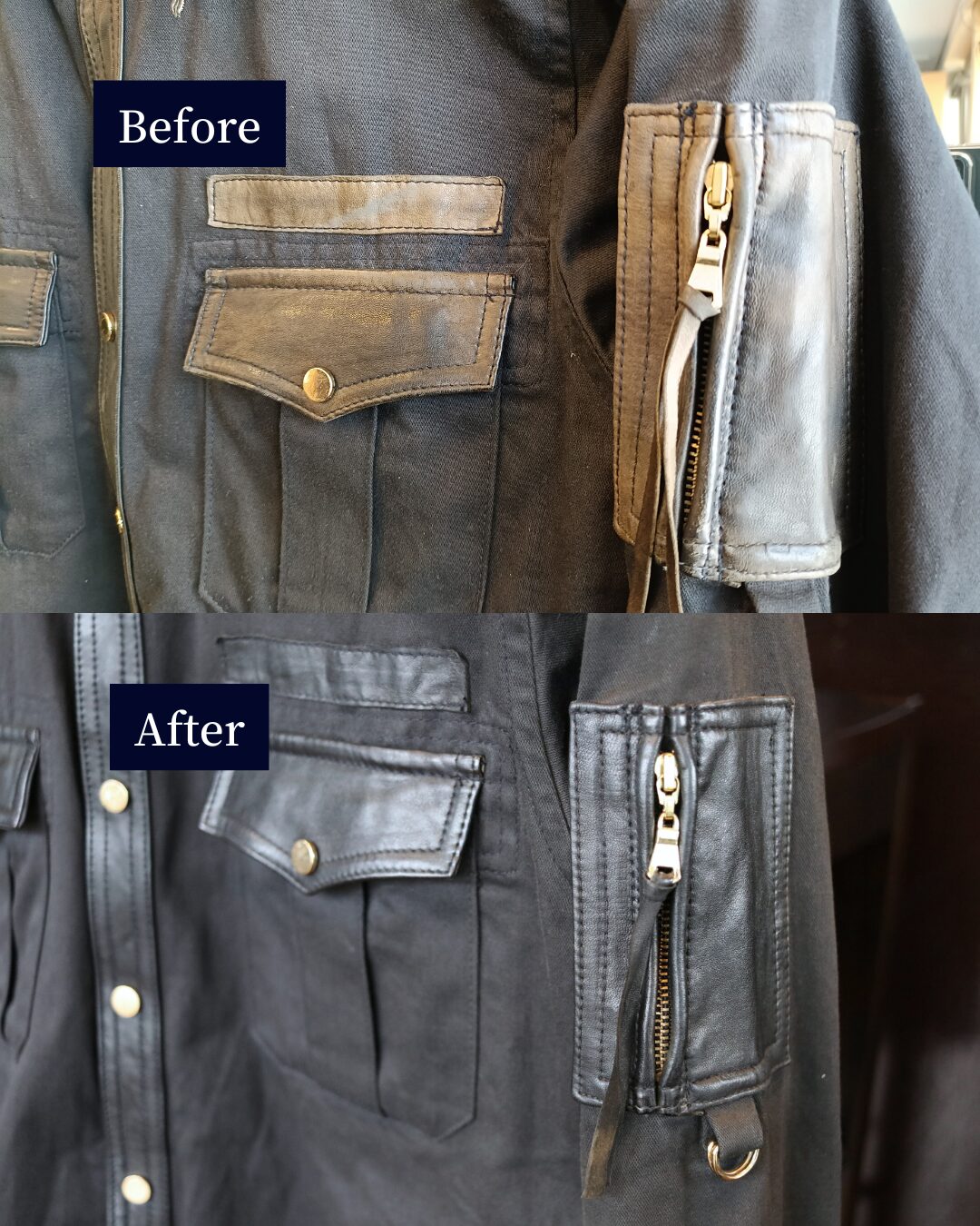 今回は、革パーツのみをブラックに再染色 することで、ジャケット全体を引き締める方向で仕上げました。