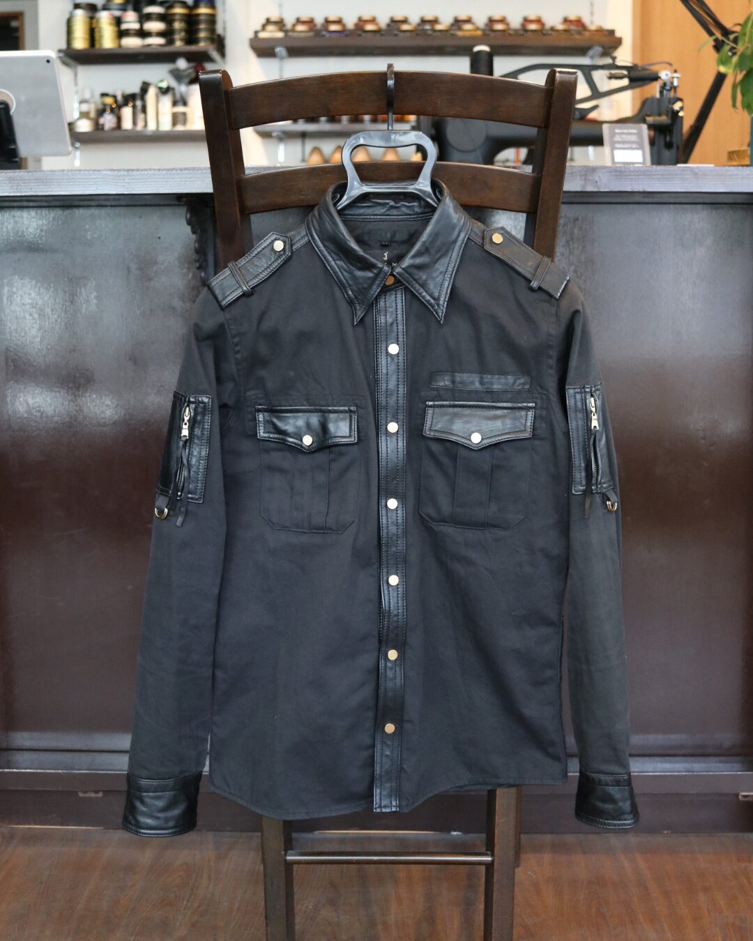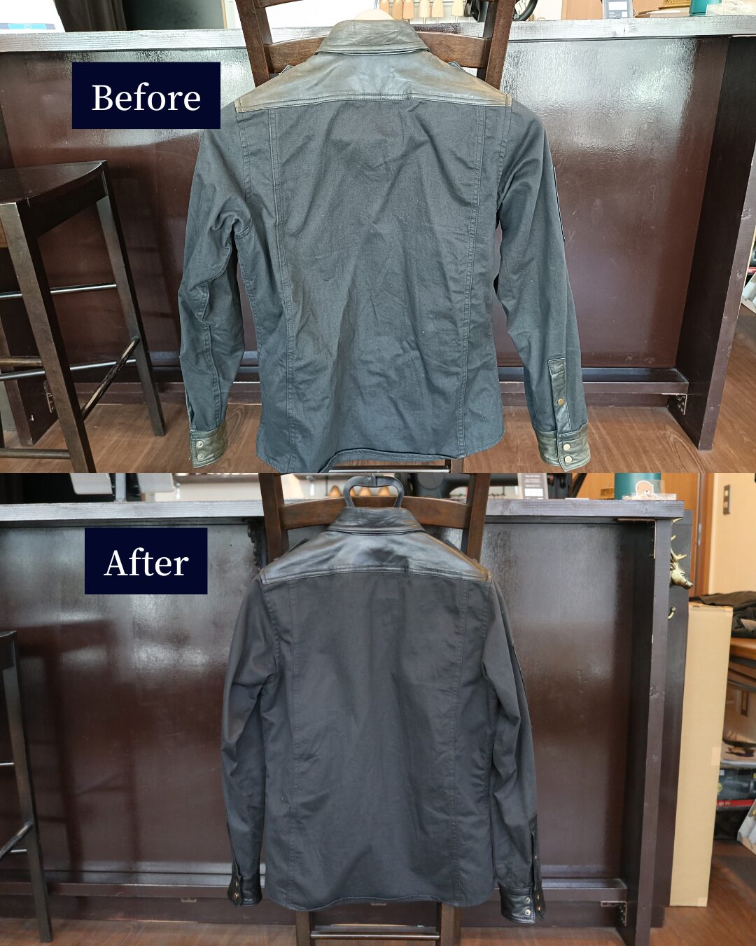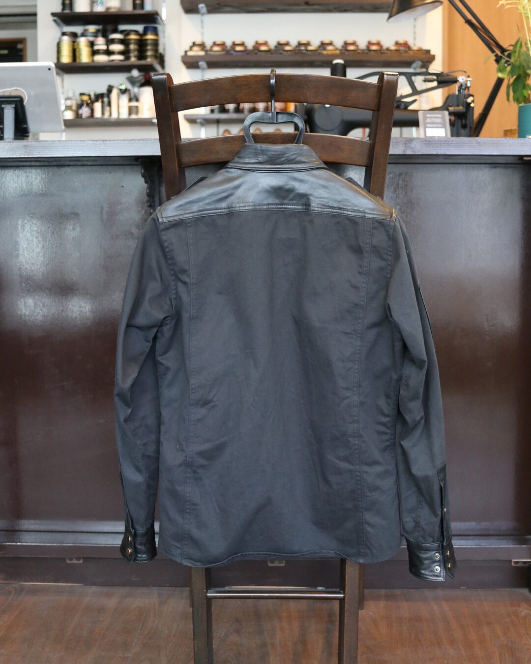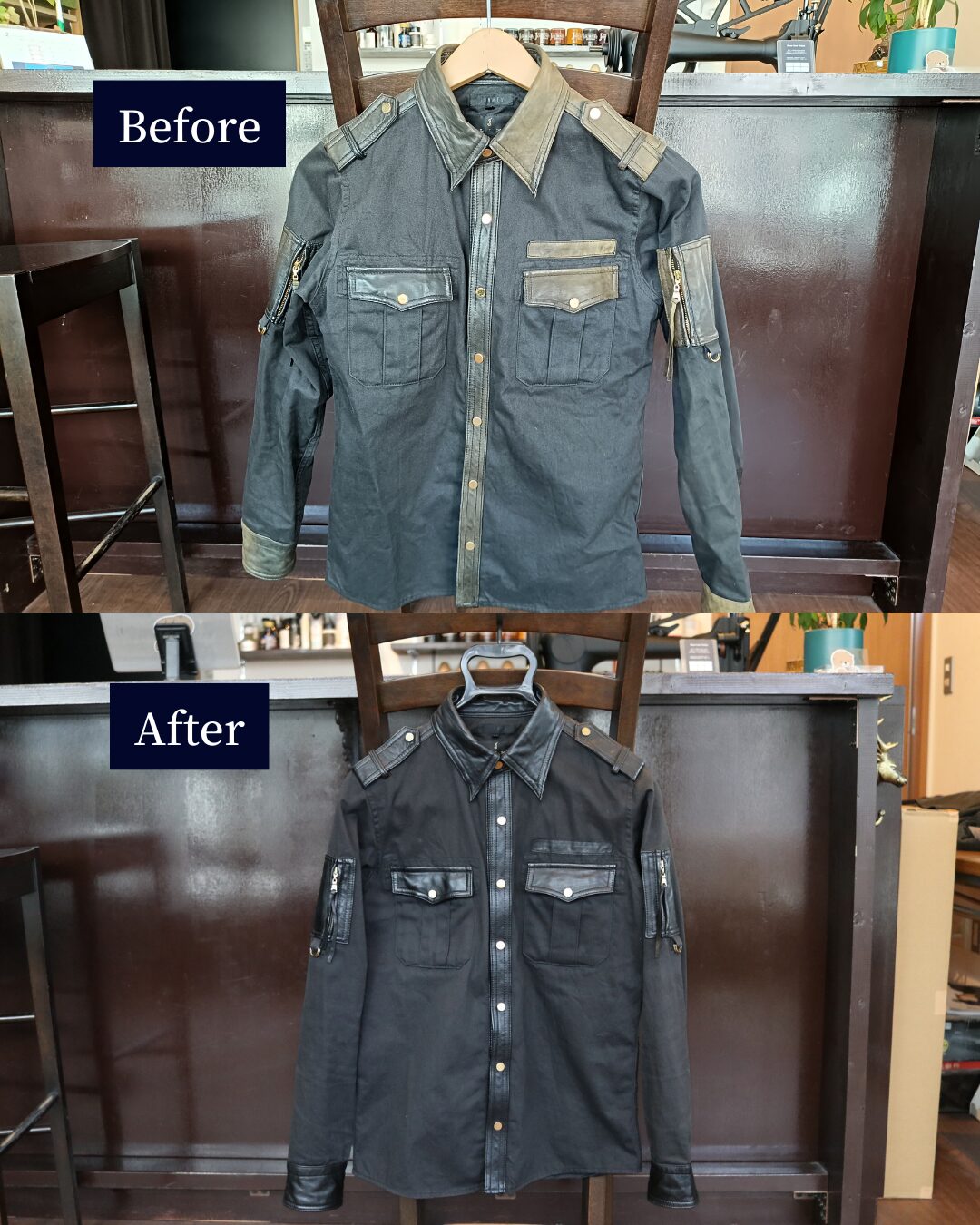 今回は、革パーツのみをブラックに再染色 することで、ジャケット全体を引き締める方向で仕上げました。