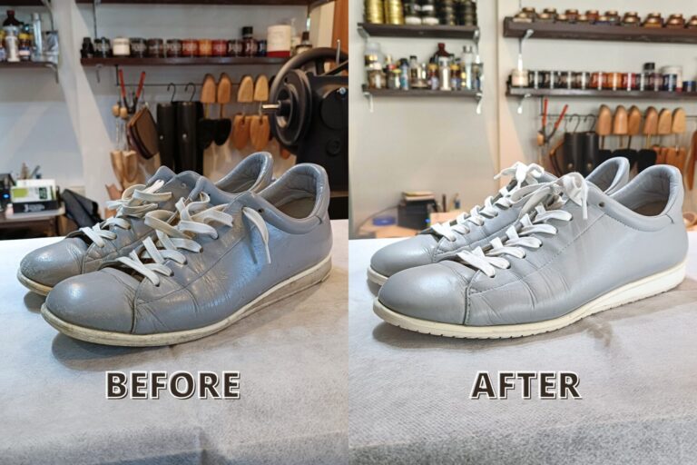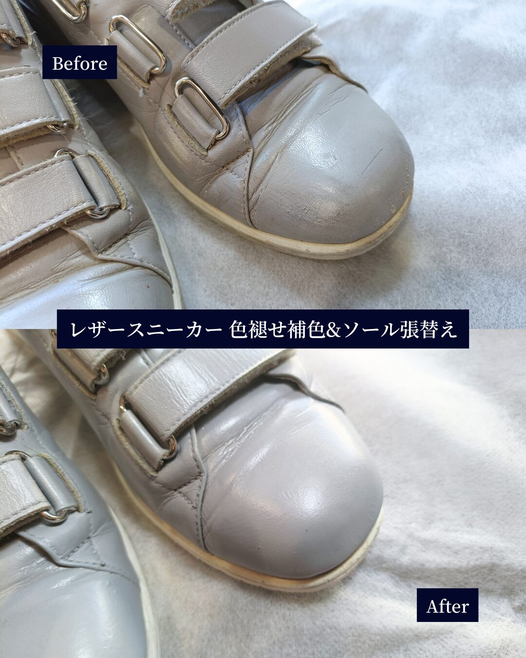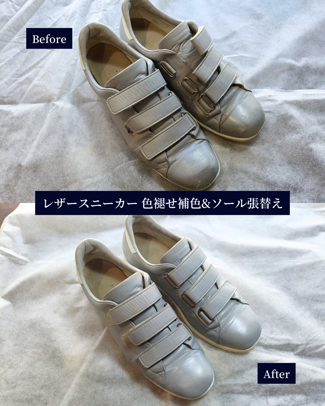 常連のお客様から、グレーレザースニーカーの補色・傷補修+ソール張替えをご依頼いただきました。