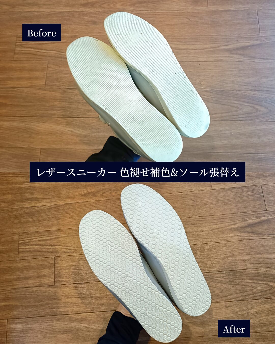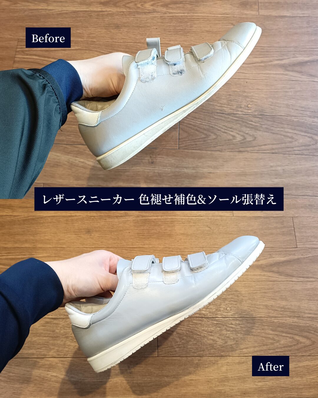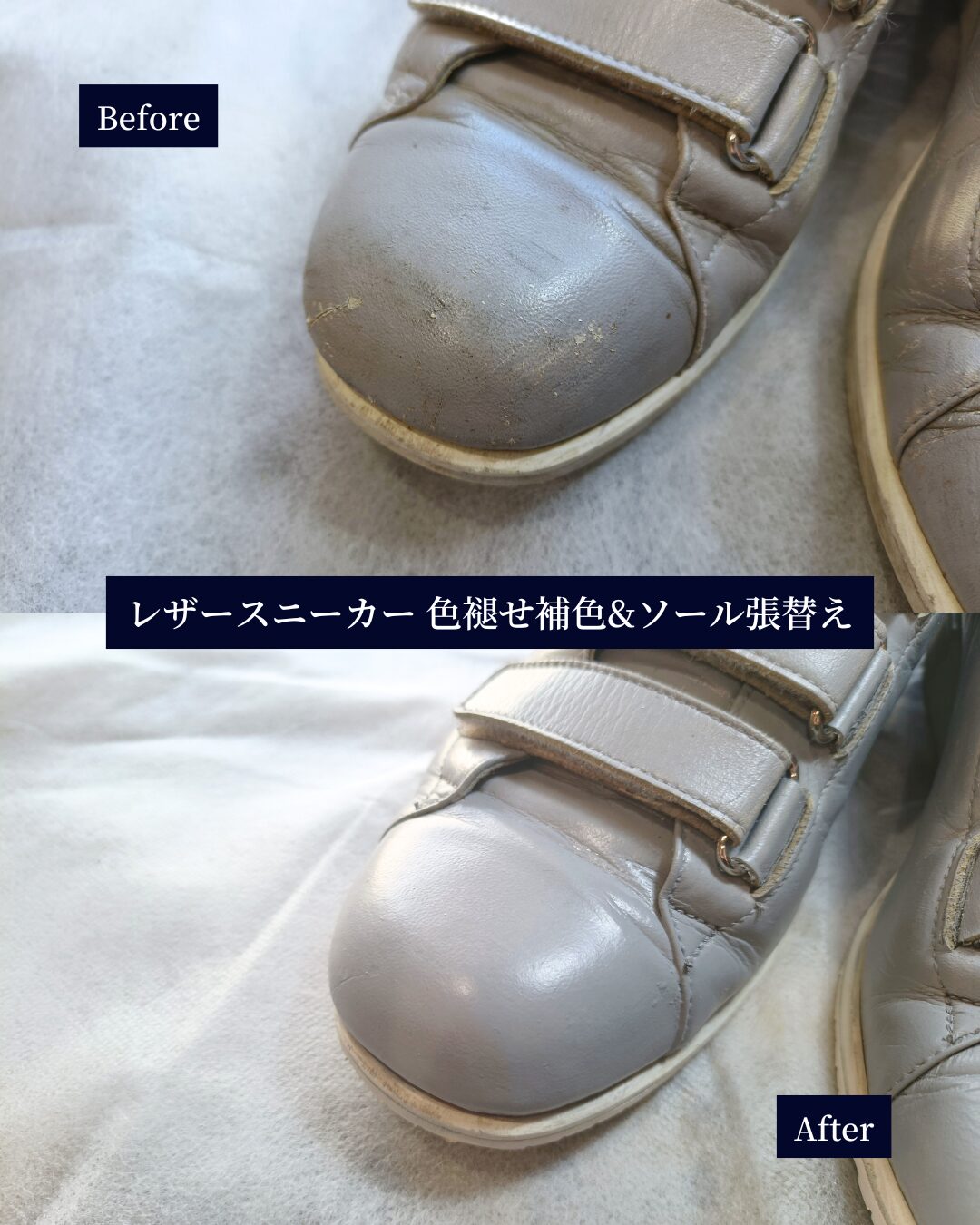 常連のお客様から、グレーレザースニーカーの補色・傷補修+ソール張替えをご依頼いただきました。