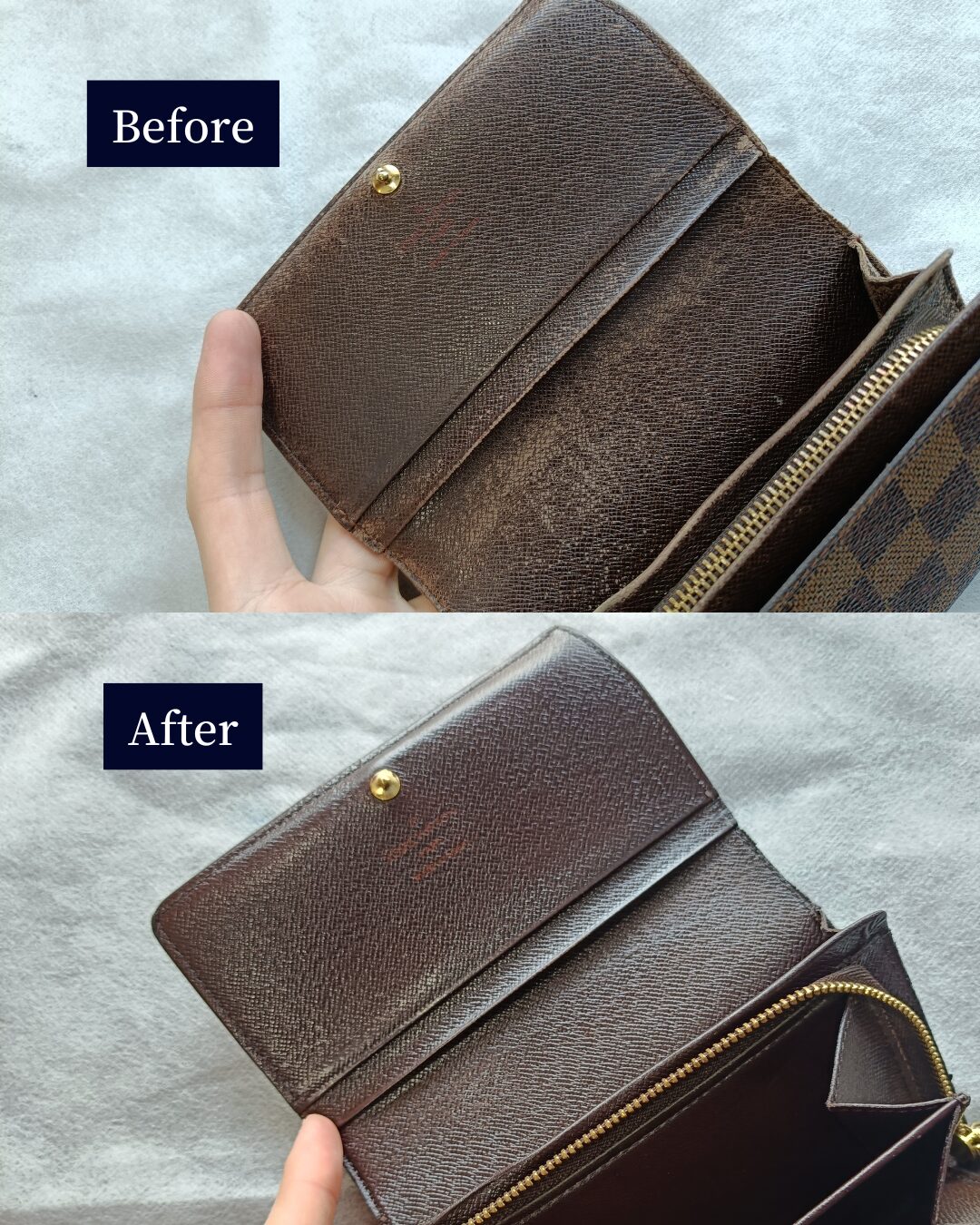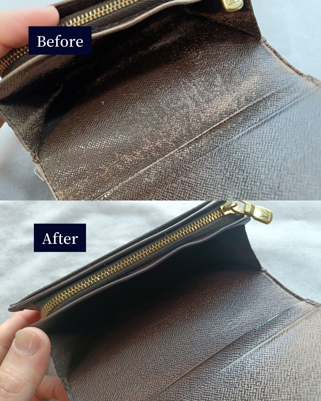 モノグラム財布の内側補色・色褪せ補修も対応しております。
