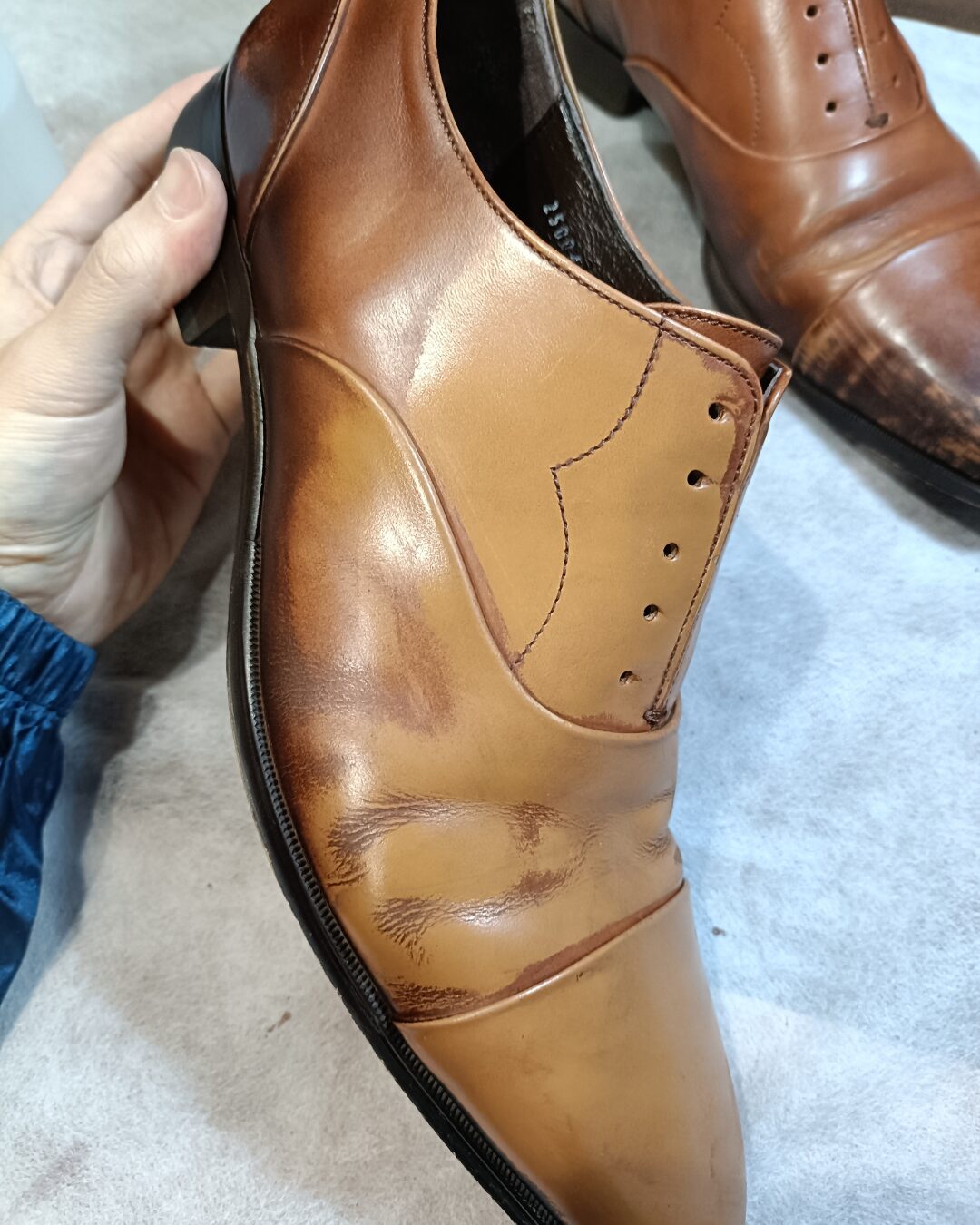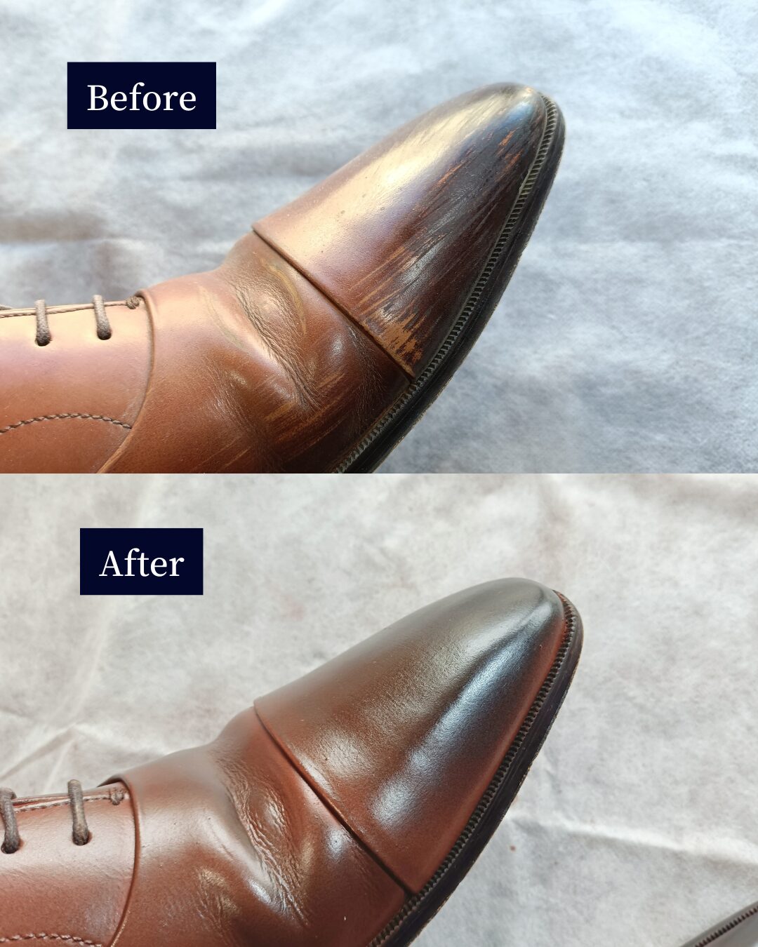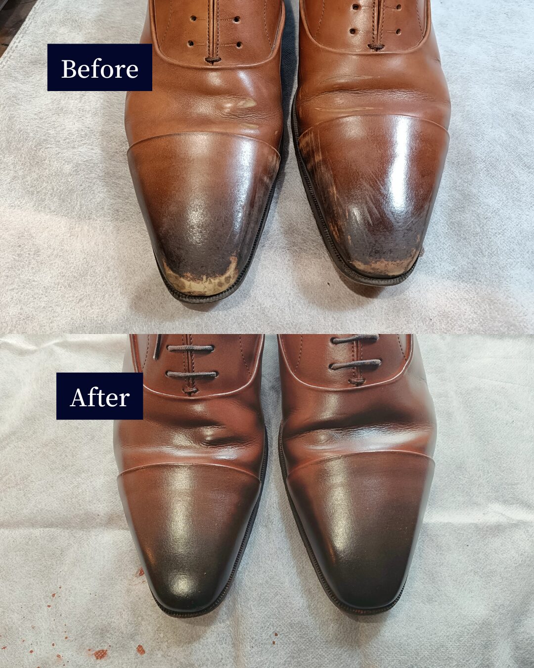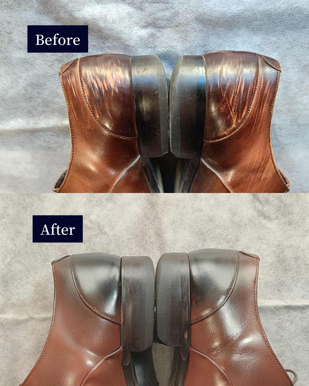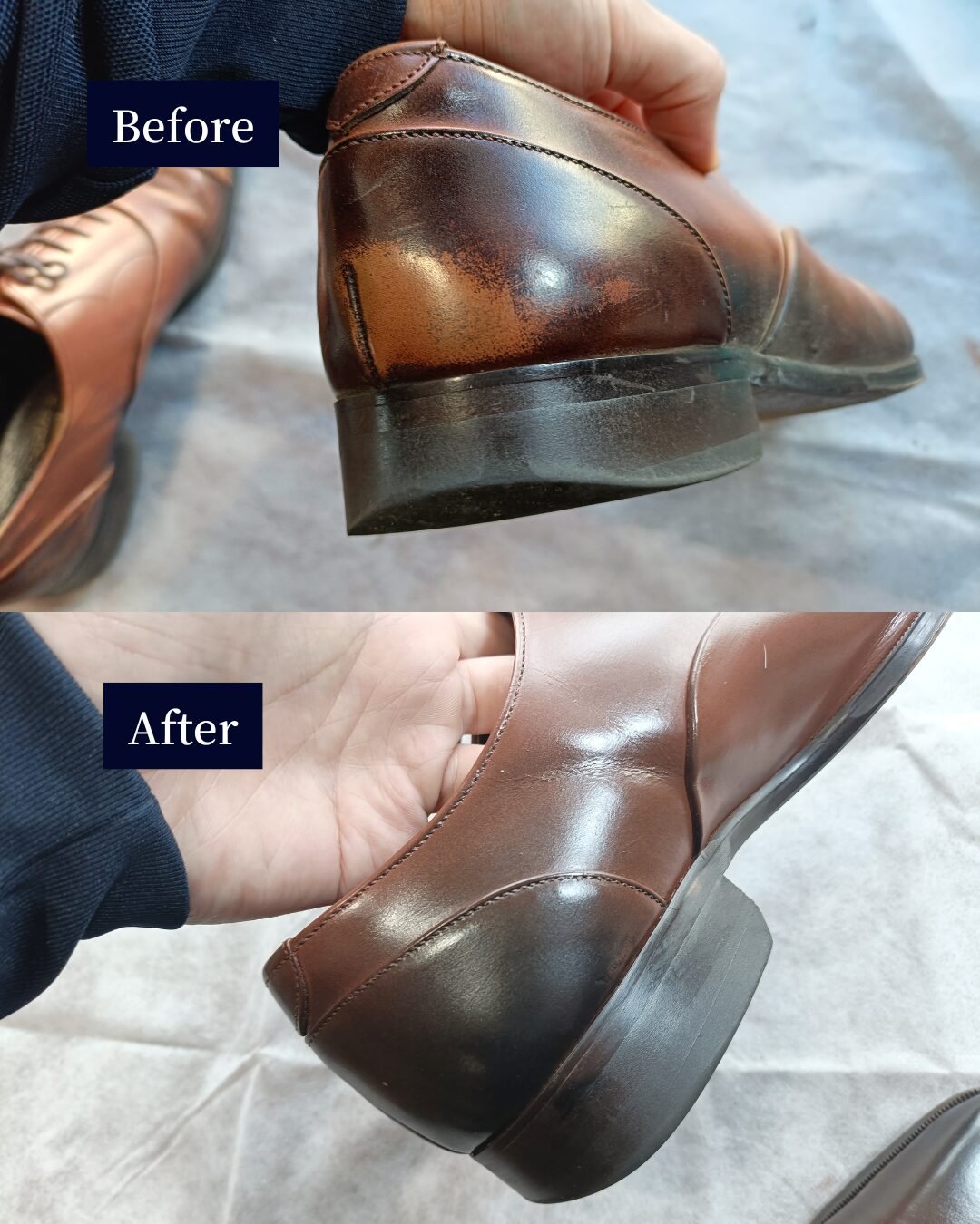 革靴の全面補色や再塗装は、知識と経験が仕上がりを左右します。