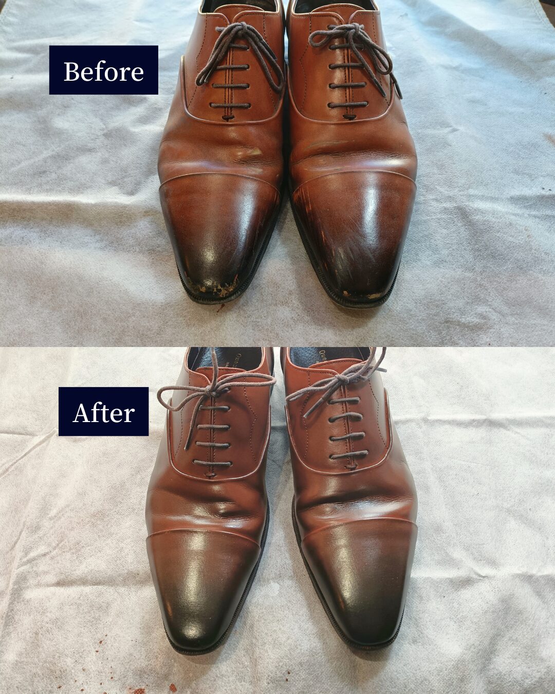 クイーンクラシコの革靴、つま先だけでなくアッパー全体にキズと色褪せが出ていたため、全面での補修・再塗装を行いました。