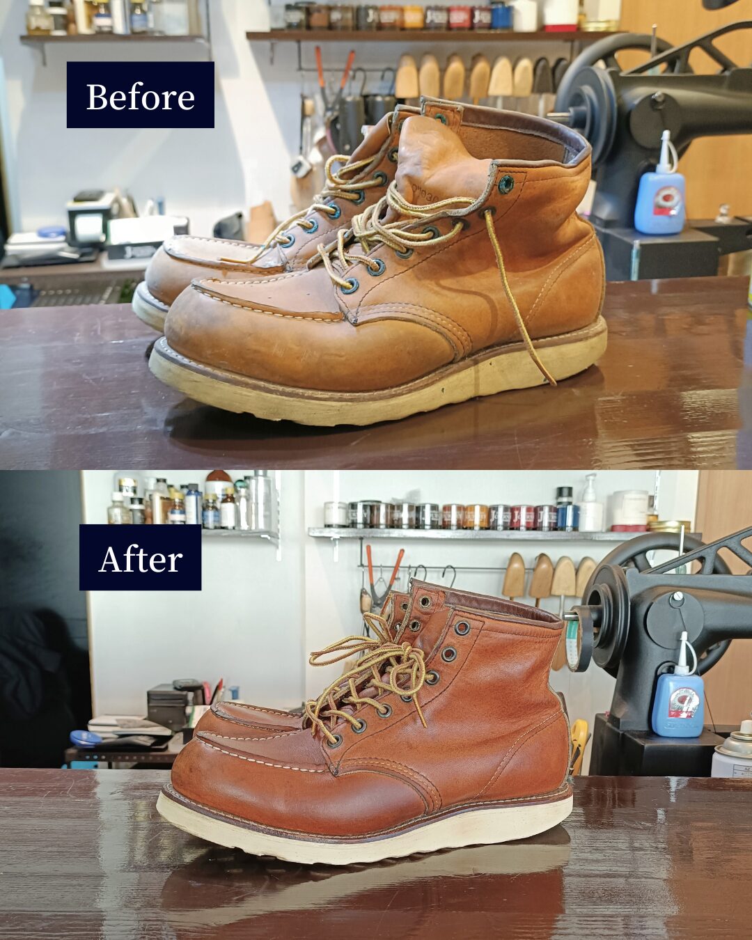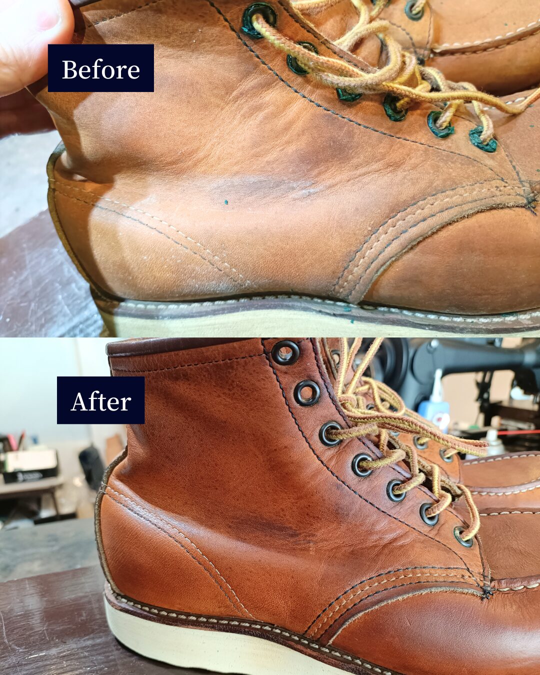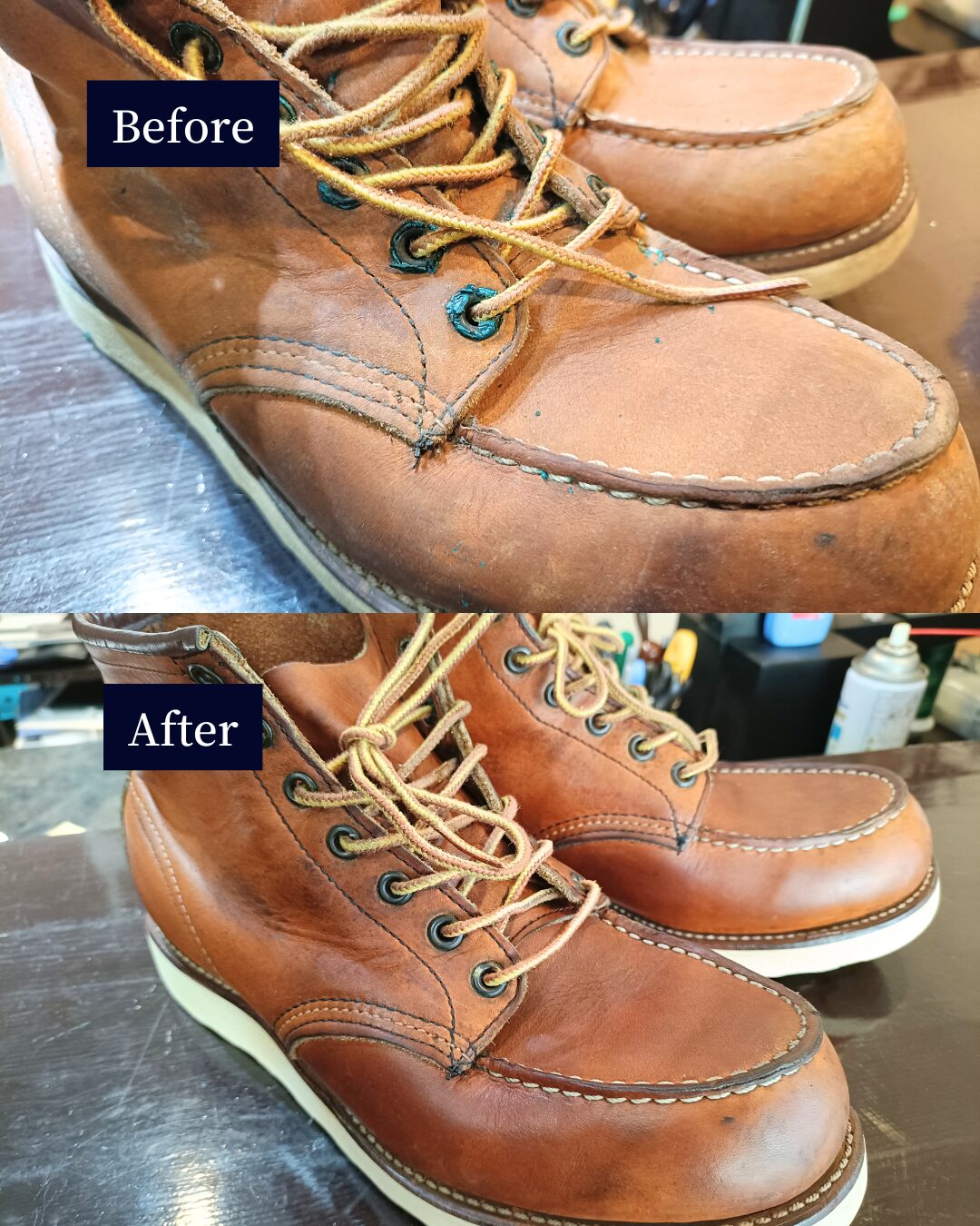 レッドウィングのカビ除去|押入れ保管で起きたトラブル 投稿日 1月 26, 2026 著者 JOURNEY カテゴリー Before/After 長年、押入れにしまいっぱなしだったレッドウィング。久しぶりに取り出したところ、全体にカビが発生していたとのこと。 今回は、丸洗いによるクリーニングでカビを徹底除去。その後、革の状態を見ながらしっかりと保湿を行い、再発防止のケアまで施しています。 カビは見た目だけでなく、革そのものを弱らせます。放置せず、早めに手を入れることで、まだまだ履ける一足に戻ります。 保管トラブルで諦めかけたブーツも、状態次第でここまで回復します。履く予定がなくても、一度リセットしておくのがおすすめです。 REDWING この記事を書いた人 JOURNEY 記事一覧