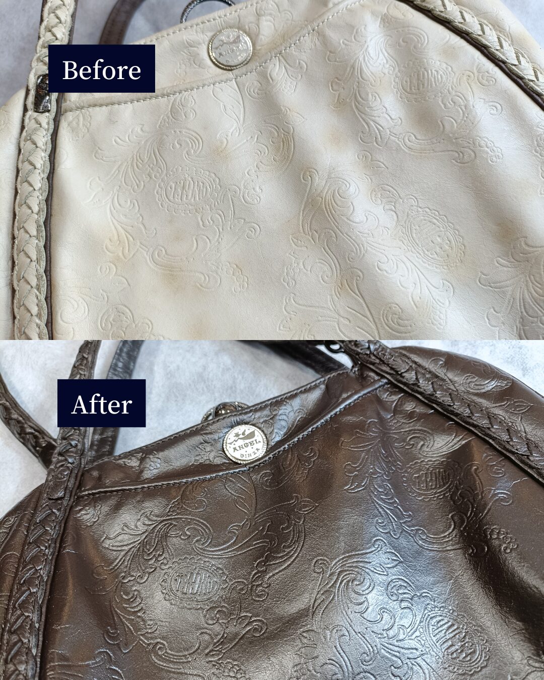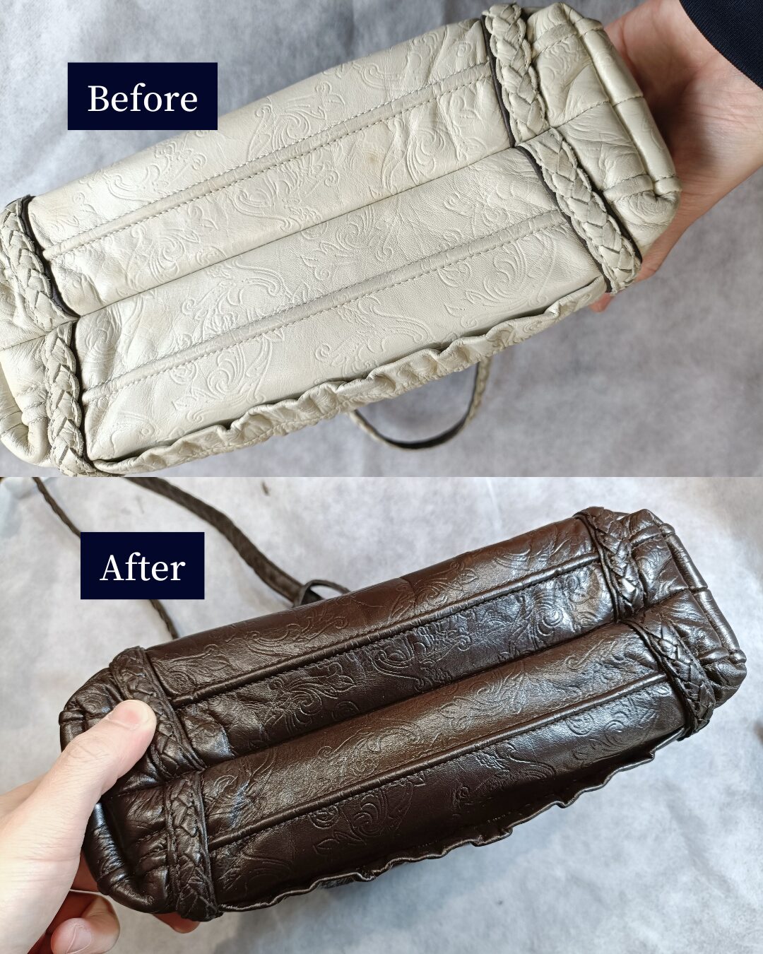 元の型押しや模様の立体感を損なわないように調整しながら、深みのある色味に仕上げました。
