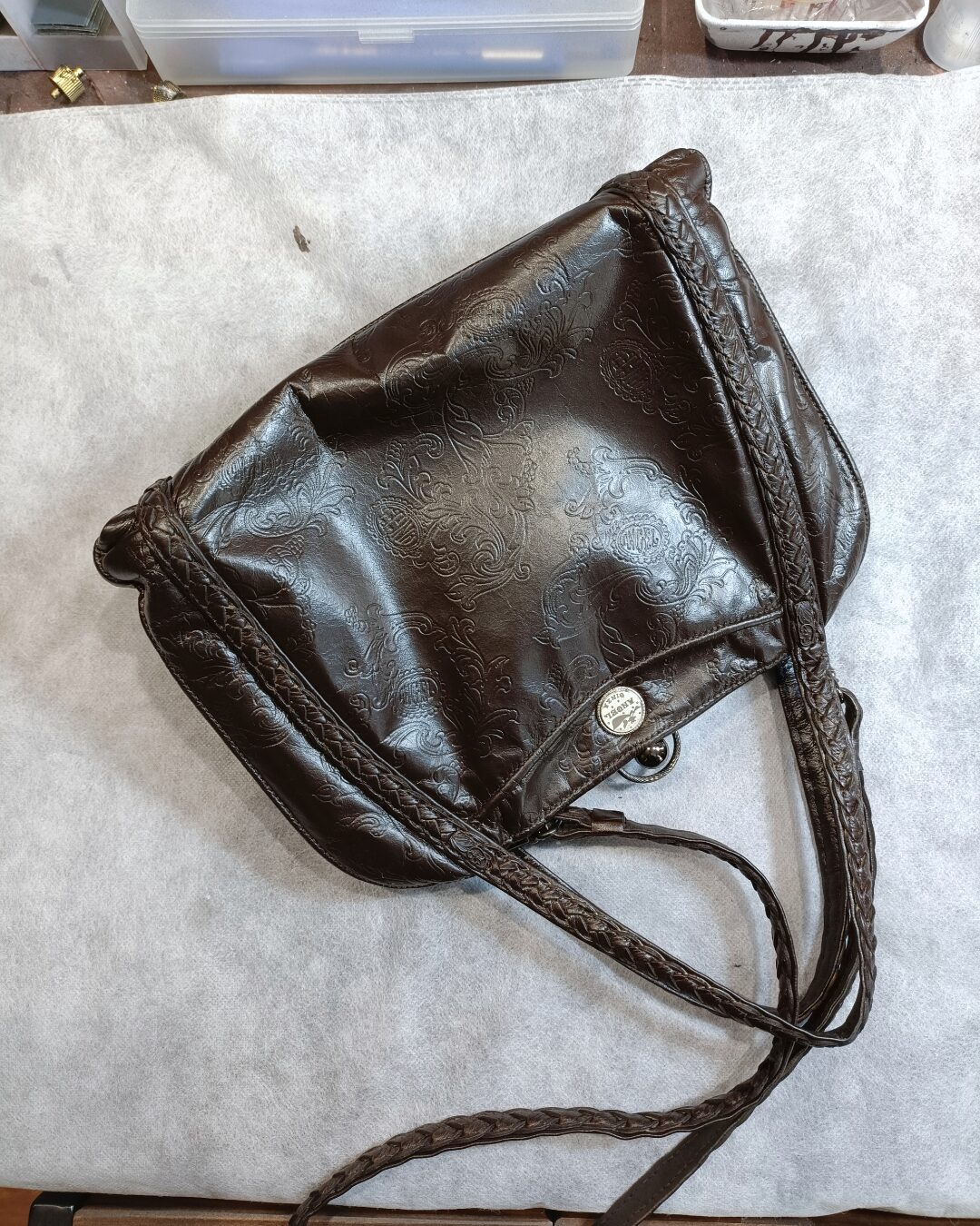 経年によるシミや汚れが目立ってきたホワイトのレザーバッグ。